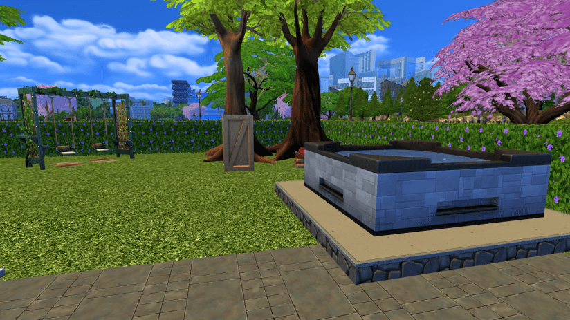 - Kid-approved garden: Little Sims can go wild in the play zone featuring a swing set, splash area, and a treehouse frame just waiting to be built. It’s a wonderland out there.