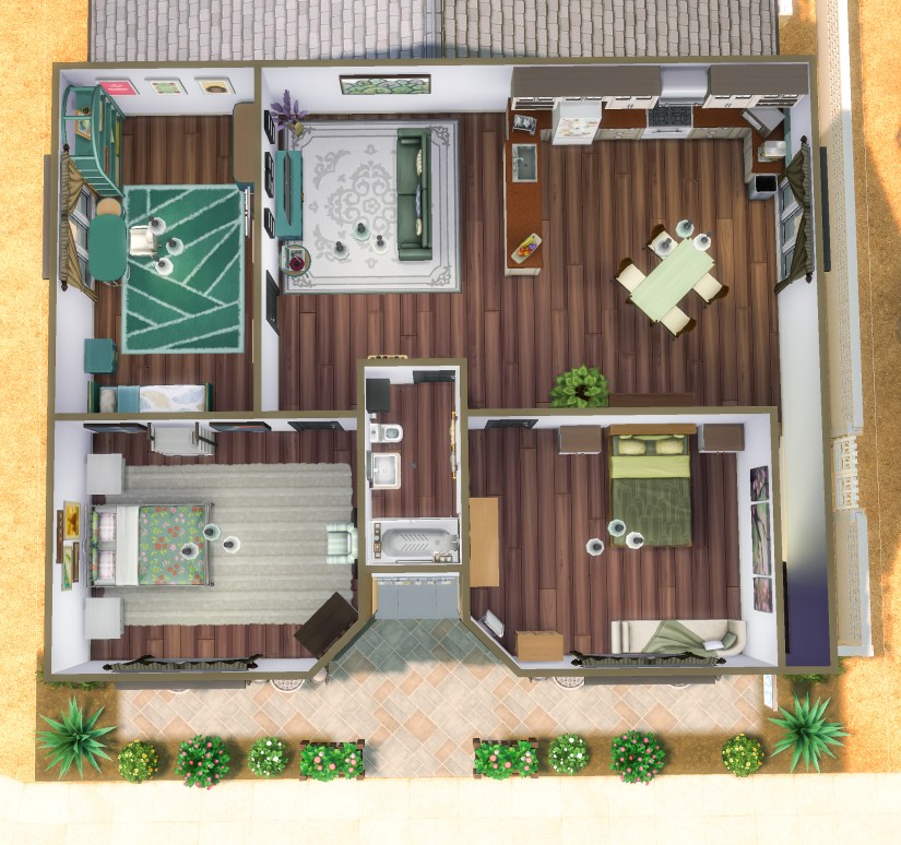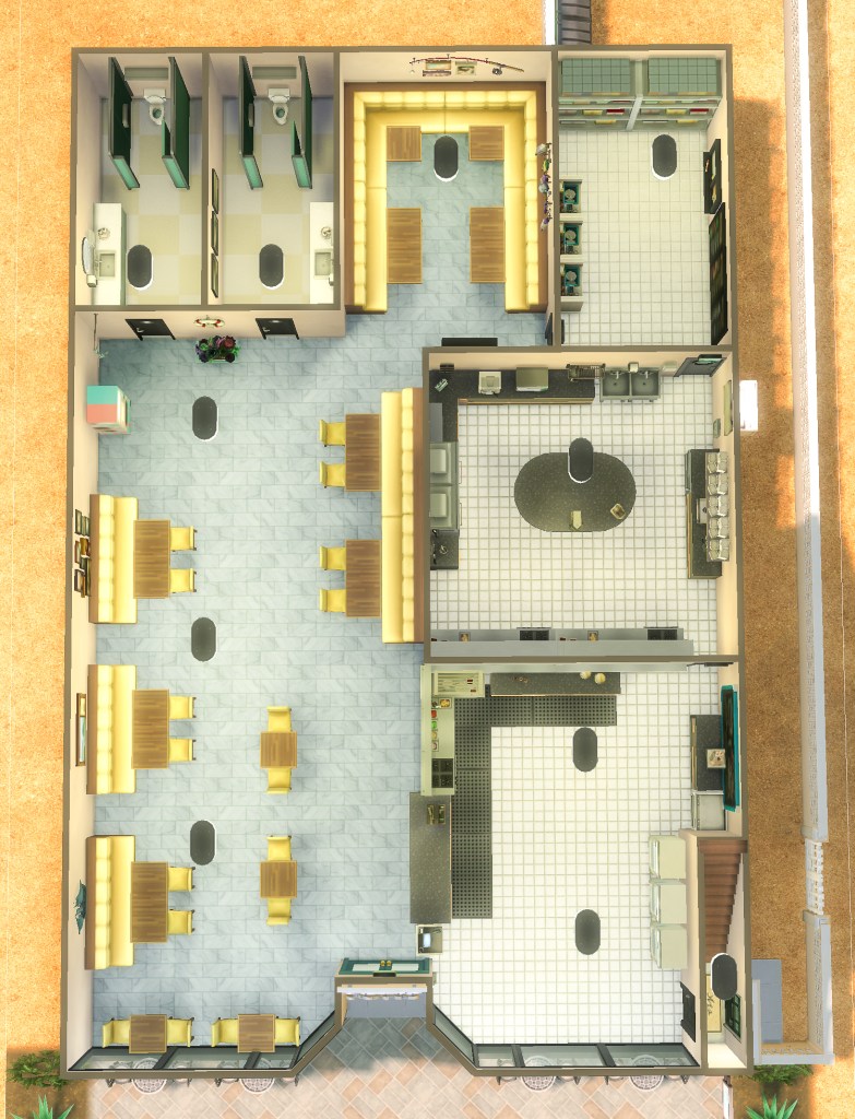 Upstairs, a private side entrance leads to a self-contained flat with three bedrooms, a family bathroom, and a cute open-plan living/kitchen/dining setup. Perfect for a family running the shop below or even as a rental apartment for Sims who donāt mind the smell of chips wafting up at tea time. Itās a true slice of community life ā comforting, convenient, and always serving up something warm.